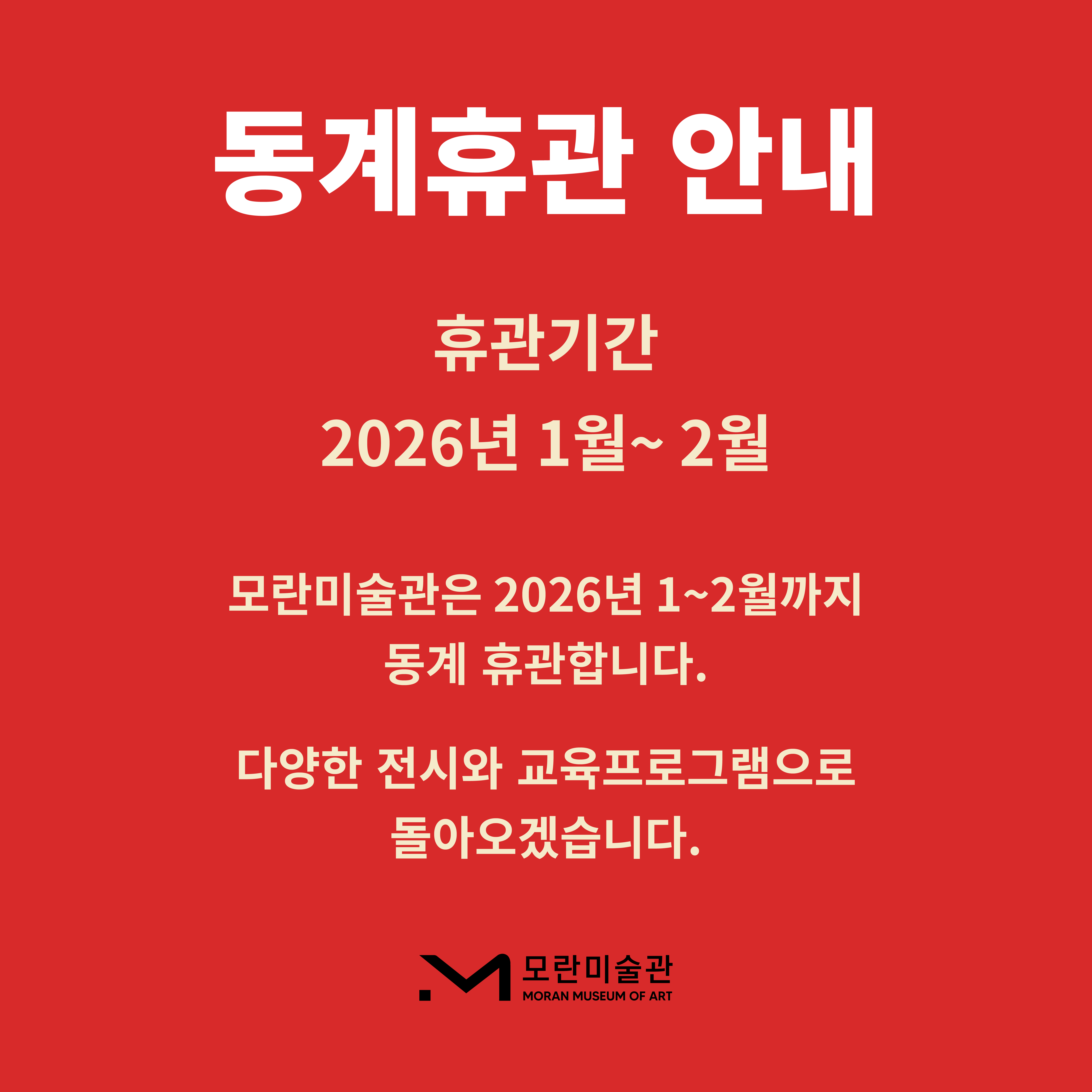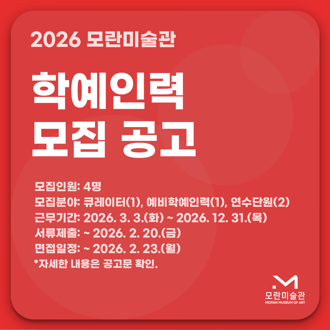 모란미술관은 보다 많은 대중들이 문화예술을 향유할 수 있도록 전시를 비롯한 교육, 출판, 국제교류, 창작지원 등의 프로그램을 기획하여 문화예술을 통한 만남과 소통의 역할을 수행하고 있습니다.