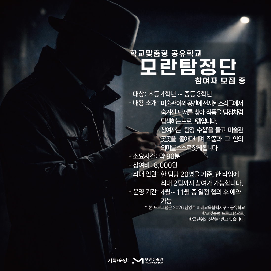 모란미술관에서는 2026 학교맞춤형 공유학교 <모란탐정단>를 운영하고 있습니다.